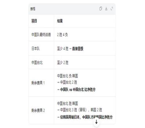 若余下一場中國臺(tái)北贏韓國,他們最終可3勝晉級(jí);韓國戰(zhàn)績來到2勝3負(fù),中國隊(duì)需指望韓國再輸給日本,再與韓國比凈勝分爭晉級(jí)名額