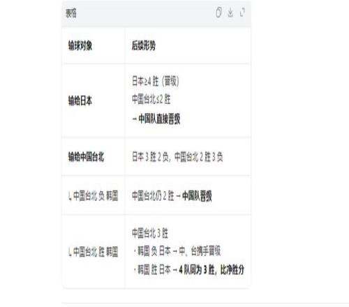 若輸?shù)倪@場是中國臺(tái)北,日本隊(duì)成績來到3勝2負(fù),中國臺(tái)北隊(duì)2勝3負(fù)。余下一輪,若中國臺(tái)北隊(duì)輸韓國,他們?nèi)?勝,中國隊(duì)晉級(jí);贏韓國,他們成績也會(huì)來到3勝3負(fù)。
