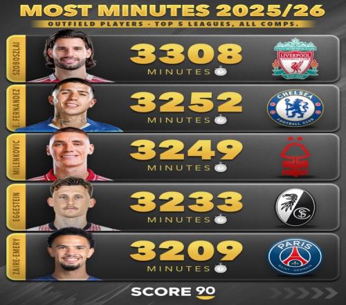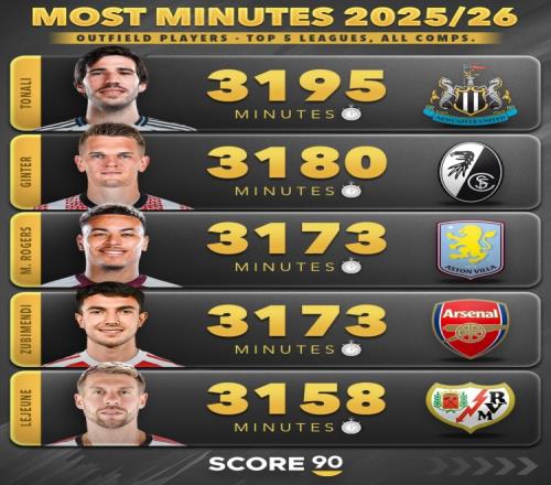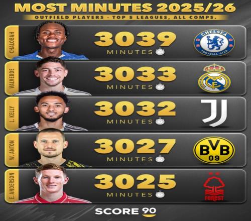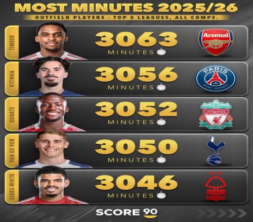 本賽季五大聯(lián)賽非門將球員出場(chǎng)時(shí)間榜:范戴克3510分鐘第三