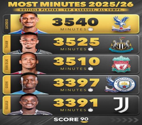 體育播報(bào)3月3日宣 Score90統(tǒng)計(jì)出了本賽季五大聯(lián)賽迄今為止,各項(xiàng)賽事出戰(zhàn)比賽時(shí)間最多的30名非門將球員,水晶宮的拉克魯瓦以3540分鐘居首,利物浦隊(duì)長(zhǎng)范戴克以3510分鐘位居第三。
