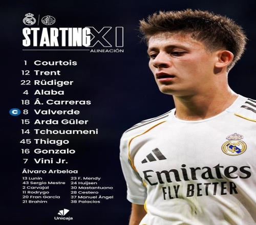 皇家馬德里首發(fā):1-庫(kù)爾圖瓦、12-阿諾德、22-呂迪格、4-阿拉巴、18-卡雷拉斯、8-巴爾韋德、15-居萊爾、14-楚阿梅尼、45-皮塔奇、16-貢薩洛、7-維尼修斯
