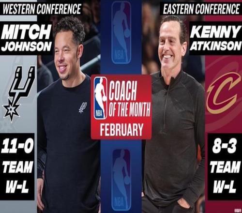 米奇-約翰遜率領馬刺打出11勝0負的2月不敗戰(zhàn)績,當選西部月最佳教練。阿特金森帶領騎士打出8勝3負的2月戰(zhàn)績,當選東部月最佳教練。