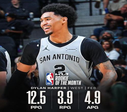 馬刺在2月則取得了11戰(zhàn)全勝的完美戰(zhàn)績(jī),其中迪倫-哈珀場(chǎng)均貢獻(xiàn)12.5分3.9籃板4.9助攻,最終他也被評(píng)為了NBA2月西部最佳新秀。