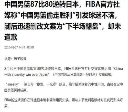 中國(guó)隊(duì)艱難取勝后,國(guó)際籃聯(lián)(FIBA)的官方社交媒體,竟用“中國(guó)男籃偷走一場(chǎng)勝利”這樣極具侮辱性的字眼來報(bào)道賽果。