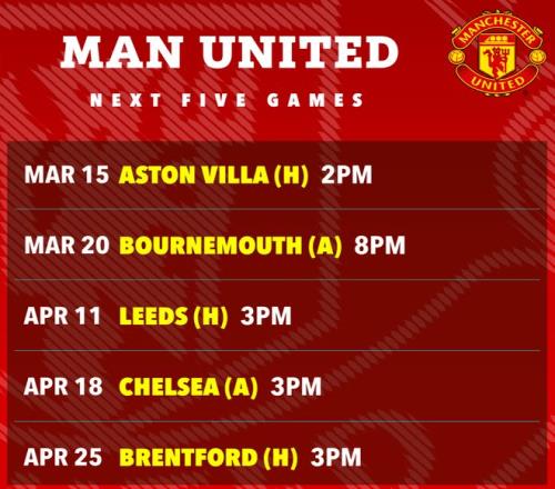 3月20日對(duì)陣伯恩茅斯的比賽后,國(guó)際比賽日將會(huì)到來(lái),曼聯(lián)到下一場(chǎng)比賽對(duì)陣?yán)澛?lián)之間,有長(zhǎng)達(dá)24天的等待時(shí)間,這場(chǎng)「玫瑰德比」被推遲了兩天,到4月13日才舉行。
