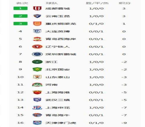 從0分打起的成都蓉城大勝深圳新鵬城之后,凈勝球4個(gè),積3分,領(lǐng)跑聯(lián)賽積分榜,展現(xiàn)中超爭冠實(shí)力。另一支從0分打起的云南玉昆3-1擊敗青島海牛,與成都蓉城同積3分,在積分榜排名第二。重慶銅梁龍客場0-0戰(zhàn)平天津津門虎,升班馬斬獲隊(duì)史中超首分,在積分榜排名第三。