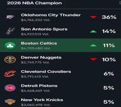 NBA最新奪冠概率更新!火勇湖三大熱門(mén)皆落選,馬刺成超級(jí)黑馬近16戰(zhàn)15勝高居第二,榜首36%斷層領(lǐng)跑。