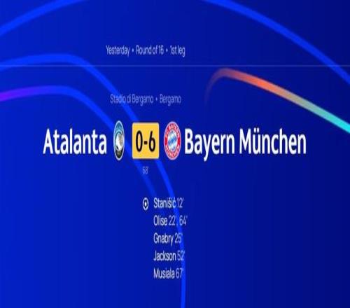 北京時間3月11日,在歐冠1/8決賽首回合的比賽中,亞特蘭大在開場67分鐘過后就被拜仁慕尼黑打進6球,目前在主場0-6落后于對手。