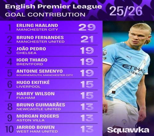 數(shù)據(jù)機(jī)構(gòu)Squawka統(tǒng)計(jì)了本賽季英超球員的參與進(jìn)球(進(jìn)球+助攻)數(shù)量,并列出榜單。曼城前鋒哈蘭德以29球高居榜首,展現(xiàn)出恐怖的進(jìn)攻效率。曼聯(lián)核心B費(fèi)以21球位列次席,切爾西前鋒若昂·佩德羅與布倫特福德前鋒伊戈?duì)枴さ賮喐辍⒙沁呬h塞梅尼奧同以19球并列第三。