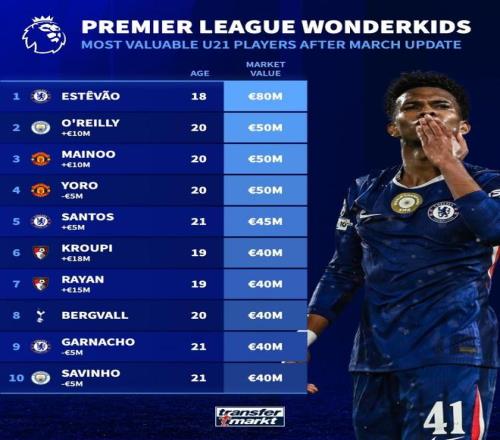 在對英超球員身價(jià)進(jìn)行更新后,德國轉(zhuǎn)會(huì)市場盤點(diǎn)了目前英格蘭頂級(jí)聯(lián)賽身價(jià)最高的U21球員。切爾西18歲邊鋒埃斯特旺以8000萬歐元高居榜首。曼城20歲中場奧賴?yán)c曼聯(lián)雙星梅努、約羅同以5000萬歐元并列第二,切爾西21歲中場桑托斯以4500萬歐元排名第五。