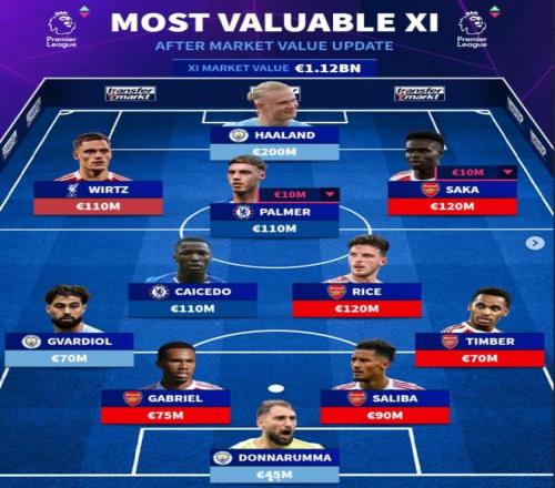 德國轉(zhuǎn)會(huì)市場更新了英超球員身價(jià),并列出身價(jià)最高的11人陣容,總身價(jià)高達(dá)11.2億歐元。曼城前鋒哈蘭德以2億歐元領(lǐng)銜,阿森納成為最大贏家,共有薩利巴(9000萬)、加布里埃爾(7500萬)、賴斯(1.2億)、薩卡(1.2億)和廷伯(7000萬)5名球員入選。切爾西的凱塞多(1.1億)和帕爾默(1.1億),利物浦的維爾茨(1.1億)以及曼城的哈蘭德、多納魯馬(4500萬)、格瓦迪奧爾(7000萬)組成了這套豪華陣容。