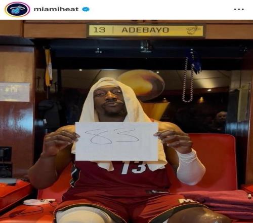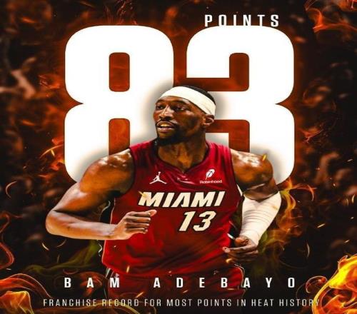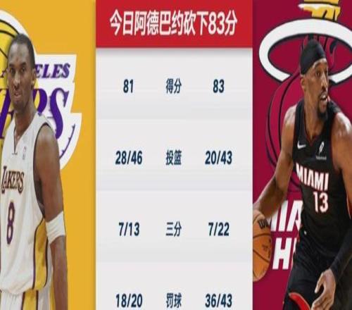 當本場比賽終場哨聲響起,比分定格在150比129,熱火豪取六連勝,而阿德巴約的名字(83分),正式超越科比(81分),獨占NBA歷史單場得分榜第二位,僅次于上古大神張伯倫的100分神跡 。