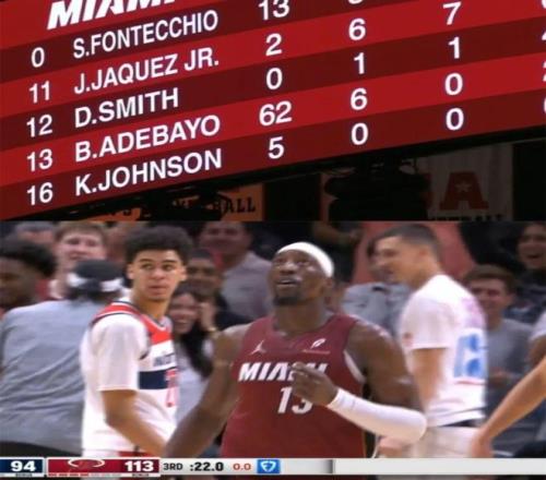 三節(jié)結(jié)束,阿德巴約拿到62分,刷新了本賽季所有球員的單場(chǎng)最高分——此前的最高分是約基奇的56分。