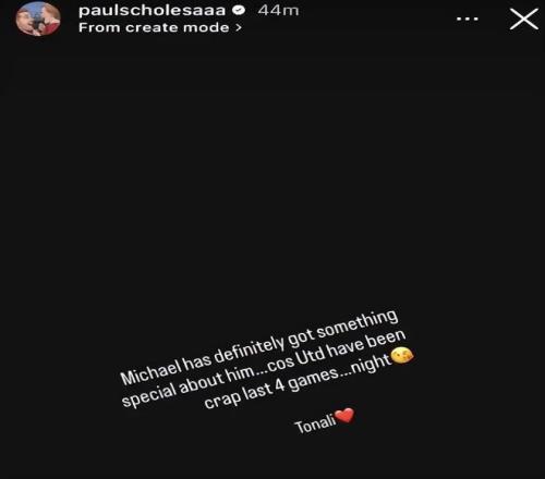 斯科爾斯在社媒上寫道:“卡里克確實(shí)有特別之處……因?yàn)槁?lián)最近四場比賽表現(xiàn)糟糕……晚安?!彪S后他刪除了這條帖子。但截屏已經(jīng)傳遍網(wǎng)絡(luò),傷害已經(jīng)造成。