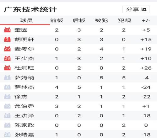 答案不妨從賽后的球員數(shù)據(jù)欄來找,賽后球員數(shù)據(jù)統(tǒng)計(jì),不難看出,廣東隊(duì)的首發(fā)和替補(bǔ)陣容的正負(fù)值差距明顯,杜潤(rùn)旺只拿到3分,正負(fù)值+26,胡明軒第四節(jié)9中1,三分6中0,但正負(fù)值依舊有+15之多,比較讓人欣慰的是麥考爾,雖然只得到了8分,但正負(fù)值高達(dá)+19(麥考爾搭配胡明軒效果不錯(cuò)),廣東隊(duì)一陣容整體表現(xiàn)出色。