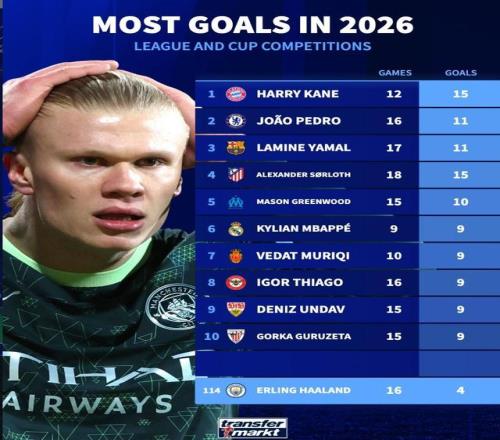 哈蘭德2026年16場(chǎng)只打進(jìn)4球,同期凱恩12場(chǎng)15球全歐第1