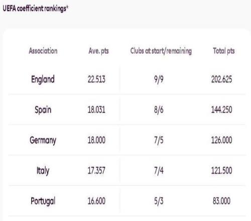 小組賽過后,英格蘭在歐足聯(lián)系數排名中遙遙領先,該排名衡量的是每個國家的俱樂部在本賽季歐洲三項賽事中的表現。只要英超能保持前兩名的位置,那么聯(lián)賽第五就能連續(xù)第二個賽季直接獲得歐冠小組賽正賽資格。