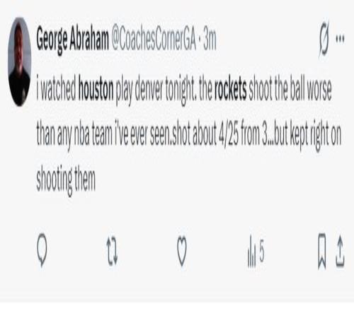 這場(chǎng)比賽火箭的慘敗讓很多記者、媒體對(duì)這支球隊(duì)的前途產(chǎn)生了質(zhì)疑,美記:我全程觀看了這場(chǎng)比賽,火箭的投籃表現(xiàn)是我見(jiàn)過(guò)任何一支NBA球隊(duì)最差的,他們?nèi)智?5中4后還在不停出手三分打鐵。
