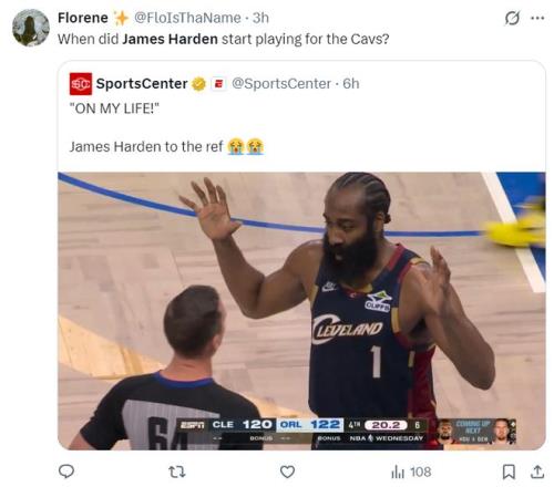 在終場前20.2秒,哈登與班凱羅爭奪一個(gè)球權(quán),裁判判魔術(shù)球權(quán),哈登說我們的球,我們沒有碰,我用我的生命發(fā)誓,我用我的生命發(fā)誓,只可惜騎士沒有挑戰(zhàn)權(quán)了,裁判還是給了魔術(shù)球權(quán),隨后貝恩就命中了一個(gè)恐怖的漂移三分球,騎士功虧一簣。