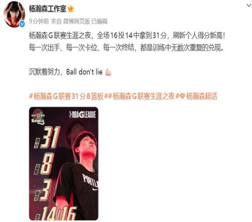賽后,楊瀚森工作室發(fā)聲:楊瀚森G聯(lián)賽生涯之夜,全場(chǎng)16投14中拿到31分,刷新個(gè)人得分新高!
