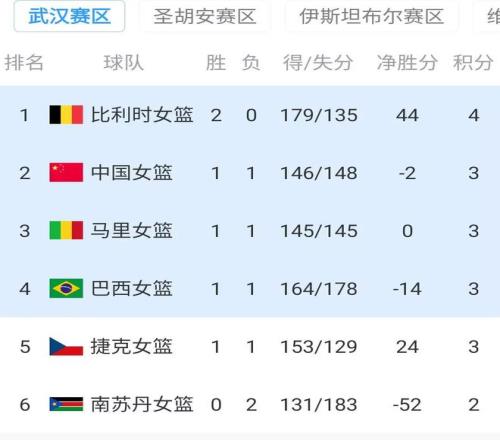 結束這一場比賽后,女籃所處的A組最新積分形勢也出來了,2戰(zhàn)全勝的比利時高居榜首,中國隊、馬里、巴西、捷克都是1勝1負積3分,分列第2-第5,中國隊凈勝分-2,憑借上一輪擊敗馬里的優(yōu)勢以及本輪捷克爆冷輸球,排名不降反升來到第二。