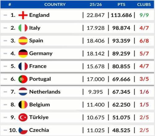 英超在歐足聯(lián)系數(shù)積分榜上遙遙領(lǐng)先