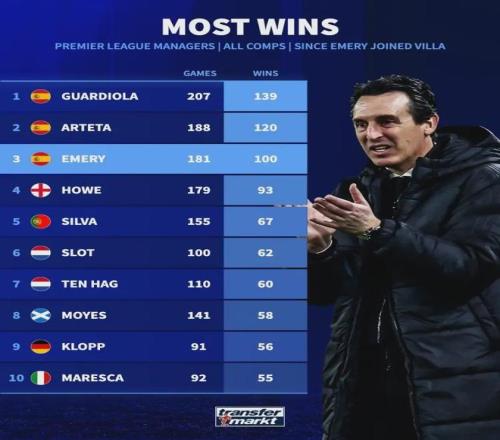 此役讓埃梅里執(zhí)教維拉勝場定格100場,僅用181場刷新隊史最快紀錄!英超主帥勝場榜:瓜迪奧拉139勝、阿爾特塔120勝,這位曾被阿森納解雇的西班牙教頭竟躋身歷史前三。百勝對手名單赫然包括拜仁、巴黎等歐冠豪門。維拉官推曬出百勝海報時,球迷淚目:“他讓維拉重拾1982年歐冠冠軍之魂!”從保級隊到歐戰(zhàn)勁旅,埃梅里用傳控紀律重塑基因:本賽季客場3-0南安普頓等戰(zhàn)役,印證“細節(jié)控”哲學。