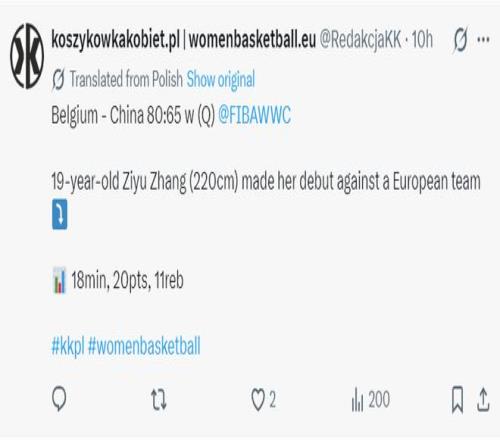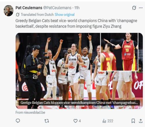 外媒寫道:比利時女籃擊敗了前世界杯亞軍中國隊,雖然中國隊的新星張子宇不答應(yīng)打出不俗狀態(tài)。