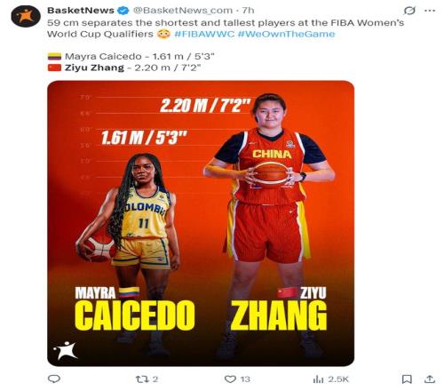 本屆世預(yù)賽張子宇7尺2(2.2米)賽事第一,而委內(nèi)瑞拉的卡伊賽多5尺3(1.61米)是賽會最矮。