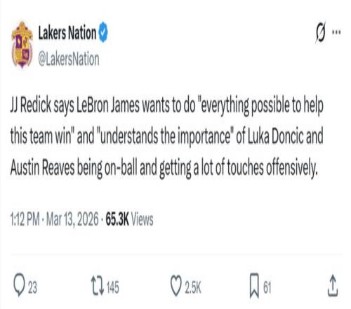 對(duì)此,賽后雷迪克稱贊道:“勒布朗渴望勝利,他愿意盡一切可能幫助球隊(duì)贏球,哪怕角色有所調(diào)整,在東契奇加盟后,他已經(jīng)做出了不少的犧牲,但他還是明白讓東契奇和里夫斯有更多持球時(shí)間的重要性,這說(shuō)明了他對(duì)球隊(duì)的關(guān)心程度,以及對(duì)身旁隊(duì)友的重視。”