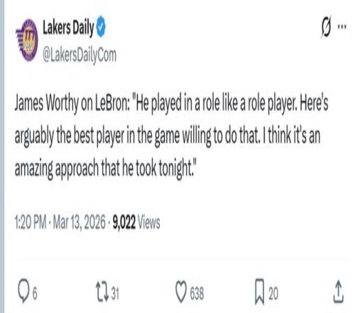 湖人名宿沃西賽后更是一針見(jiàn)血的表示:“詹姆斯打得像一個(gè)角色球員一樣,作為聯(lián)盟中最出色的球員之一,卻愿意接受這樣的改變,我認(rèn)為他今晚的態(tài)度真的非常了不起。”
