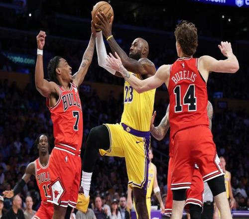 末節(jié)決戰(zhàn),里夫斯單打不中,詹姆斯被吹犯規(guī),雷迪克挑戰(zhàn)判罰成功。詹姆斯中距離取分,理查茲回敬2+1,詹姆斯強勢上籃得分,八村塁大帽布澤利斯??霞{德與米勒對射三分球,吉迪拋投取分,特雷瓊斯2罰全中,公牛將分差縮小至7分。里夫斯連續(xù)高難度單打獨得5分,芝加哥請求暫停。詹姆斯、史密斯各有2罰全中,艾頓在籃下連進2球,湖人穩(wěn)住局面。