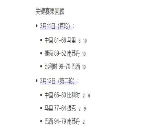 由于首輪中國女籃擊敗了馬里,第二輪馬里擊敗了捷克,對(duì)比勝負(fù)關(guān)系后,捷克凈勝分雖占優(yōu),但也只能排在第五。小組墊底是2負(fù)積2分的南蘇丹女籃。