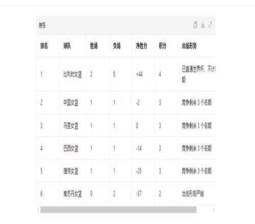 中國女籃暫時(shí)以1勝1負(fù)積3分-2凈勝分的成績,位居積分榜第二。第一名是2勝積4分的比利時(shí)隊(duì)。第三、第四、第五分是馬里女籃、巴西、捷克,她們均積3分,凈勝分分別是0、-14、24。