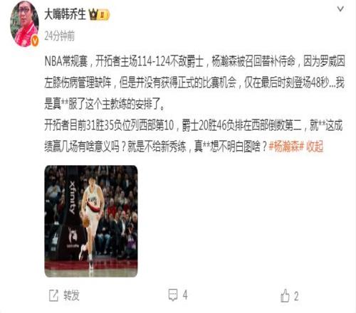 我們球迷的想法很樸素,既然開(kāi)拓者沒(méi)有KPI,斯普利特為何不大力起用培養(yǎng)鍛煉楊瀚森,他可是首輪16號(hào)秀?。?/p>