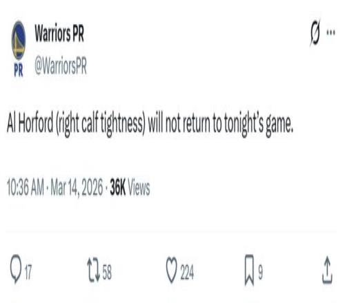霍福德僅出戰(zhàn)5分鐘后因左小腿肌肉緊繃退賽,接著小庫里與波斯特也接連傷退,勇士隊一場比賽直接傷了三人。
