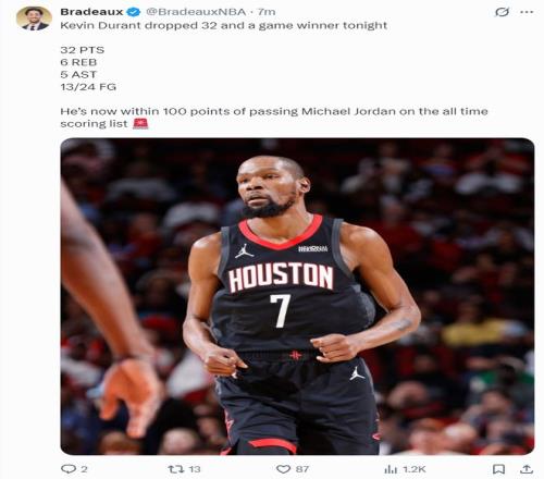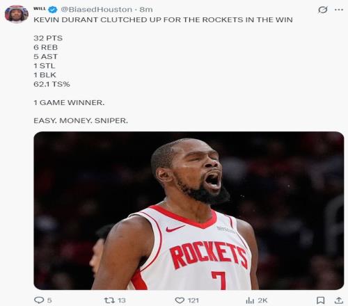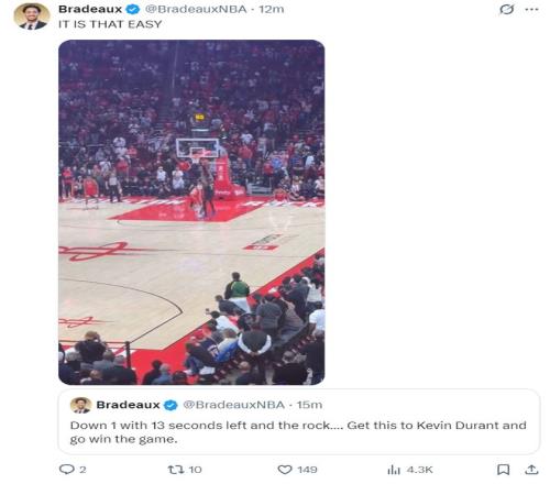 休媒Bradeaux寫道:比賽還剩13秒火箭還落后,那就把該死的球給杜蘭特,然后他會(huì)帶我們走向勝利。