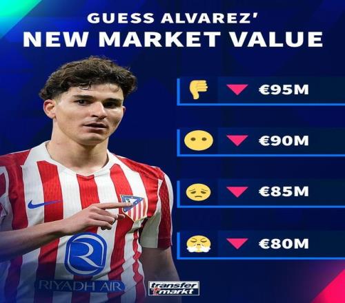 在此之前,德轉(zhuǎn)官方預(yù)熱阿爾瓦雷斯身價(jià)下跌,并列出了幾個(gè)可能的身價(jià),分別是9500萬(wàn)歐、9000萬(wàn)歐、8500萬(wàn)歐和8000萬(wàn)歐。