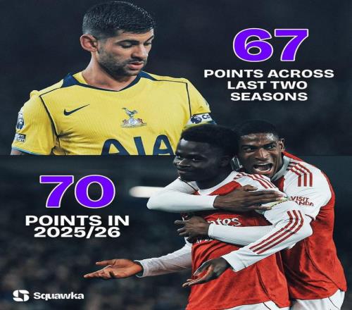 賽后來(lái)自Squawka的統(tǒng)計(jì)指出,阿森納本賽季英超31輪21勝7平3負(fù)拿到70分的成績(jī)已經(jīng)超過(guò)了同城死敵熱刺近兩個(gè)賽季的英超積分總和。