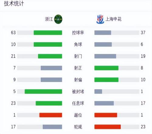 這場(chǎng)比賽,上海申花從場(chǎng)面到結(jié)果,都無(wú)法讓人滿意。賽后數(shù)據(jù)顯示,上海申花面對(duì)浙江隊(duì),竟然全面處于劣勢(shì),控球率只有37%,角球比浙江隊(duì)少4個(gè),射門(mén)次數(shù)、傳球成功率以及任意球次數(shù),都不如浙江隊(duì)。從數(shù)據(jù)統(tǒng)計(jì)看,上海申花最終能1:1戰(zhàn)平浙江,不僅不應(yīng)該感到遺憾,還應(yīng)該感到慶幸。
