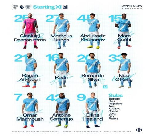 曼城客戰(zhàn)西漢姆聯(lián):哈蘭德、馬爾穆什首發(fā),塞門(mén)約出戰(zhàn)