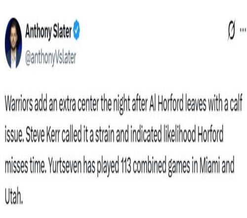 老將中鋒霍福德因右小腿受傷,預(yù)計(jì)將缺席多場(chǎng)比賽。據(jù)勇士隊(duì)記Slater透露,39歲的霍福德被確診為比目魚肌(小腿)拉傷,塞斯-庫(kù)里則是左內(nèi)收肌拉傷。除波斯特出戰(zhàn)成疑外,上述所有球員都將缺席周一對(duì)陣尼克斯的比賽。