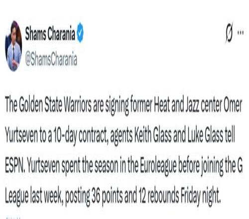 北京時(shí)間3月15日,據(jù)名記Shams報(bào)道,勇士將以一份10天短合同簽下自由球員中鋒尤爾特塞文,經(jīng)紀(jì)人證實(shí)了這一消息。