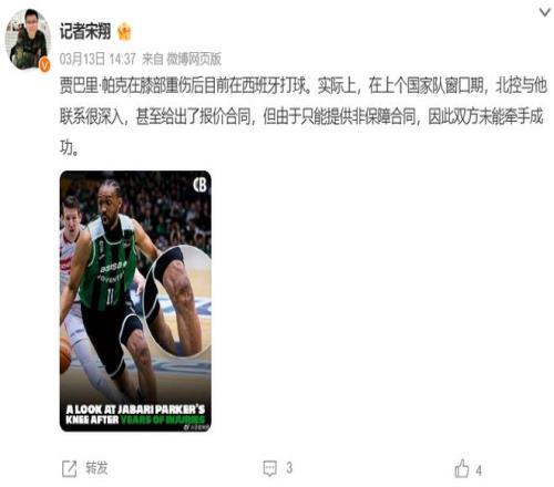 據(jù)國內(nèi)知名籃球記者報(bào)道:北控隊(duì)前不久與賈巴里-帕克深入接觸,然而因?yàn)橹荒芴峁┓潜U虾贤?,雙方最終未能達(dá)成合作。
