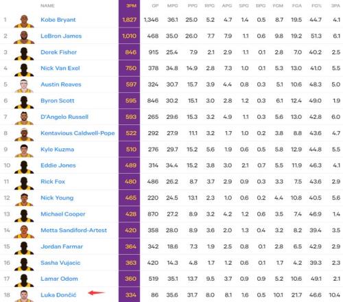 4.湖人生涯已經(jīng)命中334個三分隊史超魔術(shù)師升第18位;
