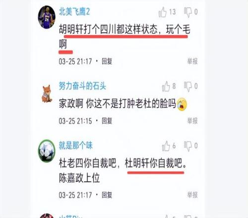 賽后廣東球迷吵翻天,矛頭直指杜鋒和他的愛(ài)將胡明軒。他們說(shuō),“打個(gè)四川,第一節(jié)得13分,這5個(gè)首發(fā)真的是廢,手忙腳亂完全不知道在干嘛”、“這幾場(chǎng)杜峰給小胡首發(fā)就像五毒卡之前一直給醫(yī)生”、“胡明軒打個(gè)四川都這樣狀態(tài),玩?zhèn)€毛阿”,球迷呼吁:讓胡明軒自裁走人。胡明軒已不單單是本場(chǎng)比賽表現(xiàn)拉胯,而是本賽季到目前為止都低迷,最近6場(chǎng)比賽均是得分個(gè)位數(shù)。盡管他表現(xiàn)糟糕,杜鋒一直讓他打首發(fā),他真的是愧對(duì)了杜鋒的厚愛(ài)。你們說(shuō)呢?