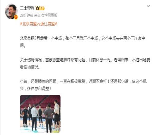 根據(jù)媒體人三土帶刺報道:“小曾(曾凡博),還是膝蓋問題,一直在積極康復(fù),近期不會打!還是那句話,借這個機(jī)會,多休息和調(diào)整!”
