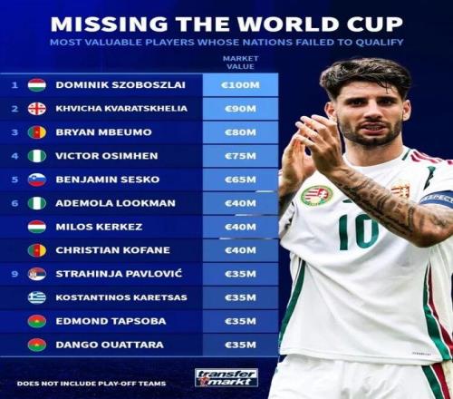 世歐預(yù)附加賽進(jìn)入決賽階段,德轉(zhuǎn)官方統(tǒng)計(jì)無(wú)緣今夏世界杯身價(jià)最高的球員。匈牙利當(dāng)家球星、利物浦中場(chǎng)索博斯洛伊以1億歐領(lǐng)銜。