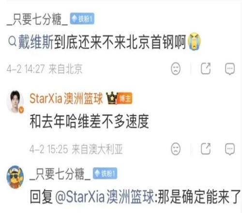 在賽后的新聞發(fā)布會上,北京男籃主教練許利民也表達了對球員表現(xiàn)的不滿。另外他還被問到了球隊是否會對外援升級的問題。對此許利民表示,球隊也一直在挑選更好的外援,但具體還要根據(jù)實際情況決定。隨后有北京球迷詢問了身在澳大利亞的媒體人“StarXia澳洲籃球”戴維斯是否會加盟北京男籃的問題,該媒體人表示,戴維斯加盟北京男籃的時間會和去年哈維加盟上海男籃的時間差不多。也就是說,戴維斯是確定會加盟北京男籃的,雙方應(yīng)該已經(jīng)達成了加盟意向。
