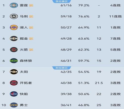 本賽季至今,湖人以50勝27負(fù)高居西部第三,不過只領(lǐng)先第四的掘金1個(gè)勝場。